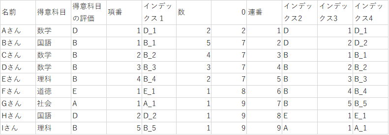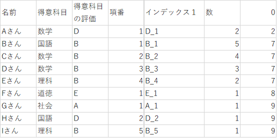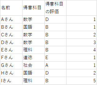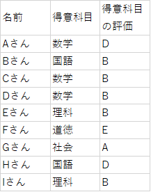 まずは、「得意科目の評価」に複数の同じ値があるので、それぞれ区別できるようにします。