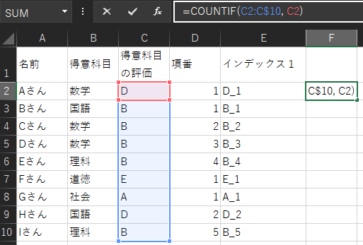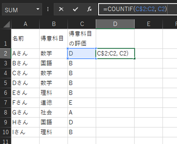 この関数の範囲指定には、絶対参照を意味する$を使用します。COUNTIFの検索範囲で指定する2つのセルのうち、一方のみを絶対参照にすることで、数式が入力してあるセルよりも上側全ての「得意科目の評価」を検索範囲に指定できるようになります。