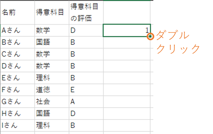 黒色の十字に変化した後、ダブルクリックすると、一番下までコピーされます。