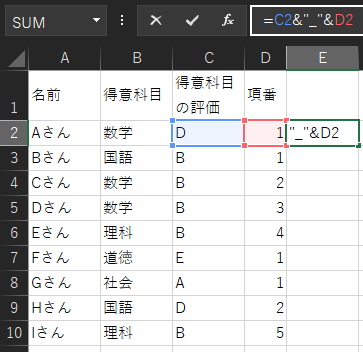 もし、「得意科目の評価」か「項番」に「_」が含まれる場合、どちらにも含まれない文字(特殊記号等)に、C2セルとD2セルの値の間の文字を変えてください!