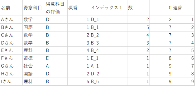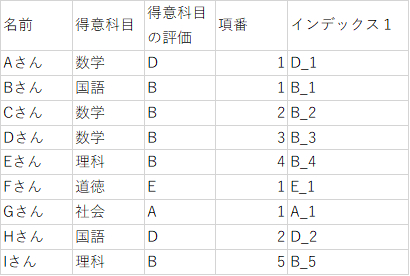 そのため、「得意科目の評価」と「項番」をくっつけて区別できるようにします。