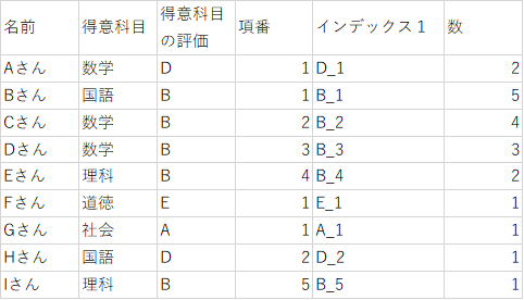 「項番」列が1のときの「数」列を見ると、同じ評価がいくつあるか分かるようになっています。
