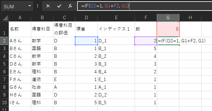G1セルには0と入力してください。