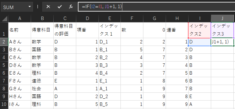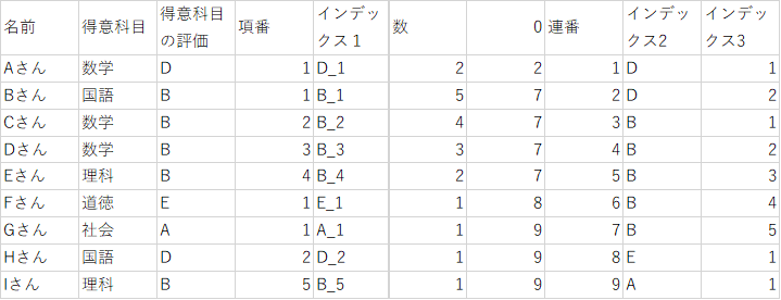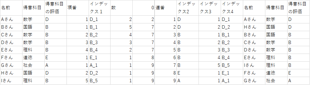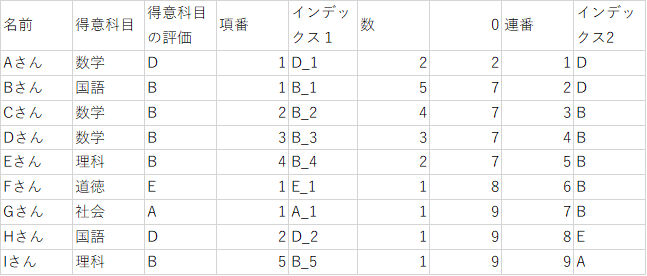 1.で振った項番だけでは、異なる「得意科目の評価」かつ同じ「項番」の場合、区別ができません。