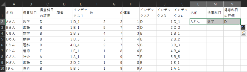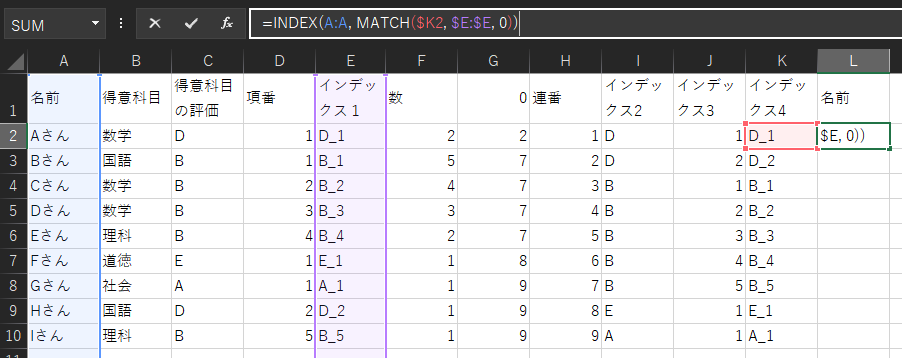 「INDEX(C:C, MATCH(H2, G:G, 0))」では、「連番」列の値と、G列の値が一致すれば、同じ行の「得意科目の評価」の値を表示します。