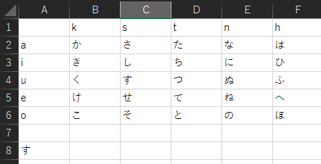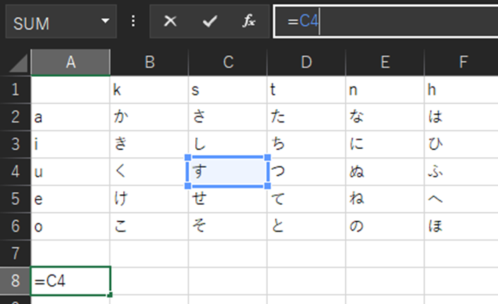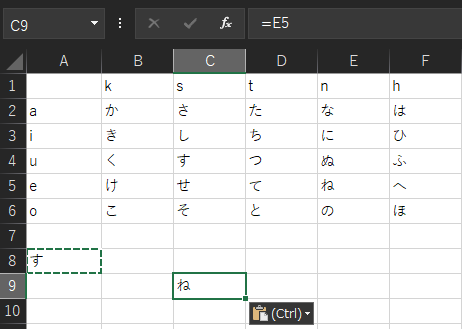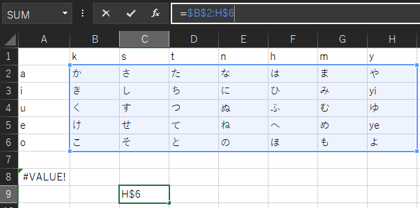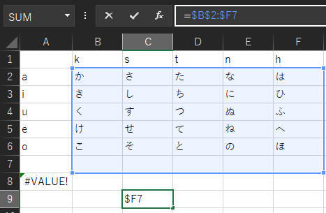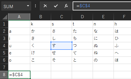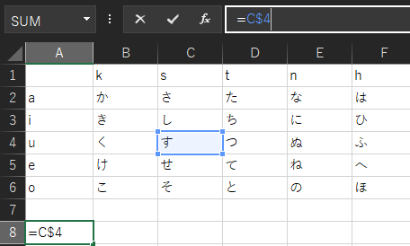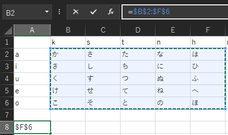 行である数字だけが変化せずに、列であるアルファベットだけが変化しました。