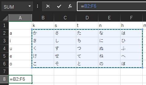 B6セルからF2セルを指定する場合も、同じ範囲を指定することになります。